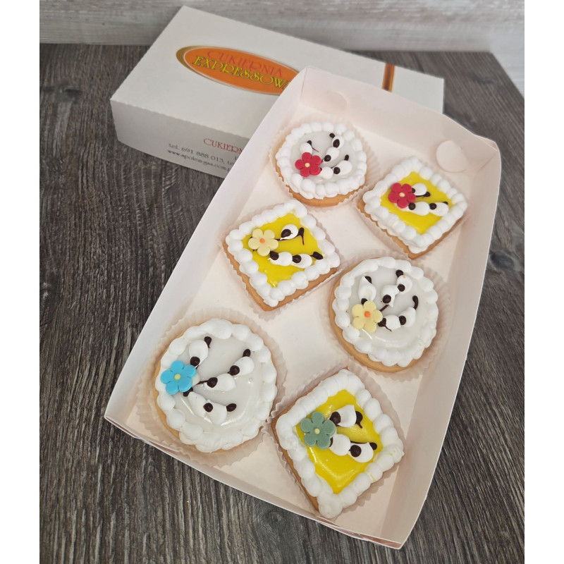 Mini mazurki na kruchym cieście , wykończone pomadą w różnych kolorach , dekorowane. Kartonik zawiera 6 szt. mini mazurków - w sam raz do koszyczka lub dekoracji stołu wielkanocnego