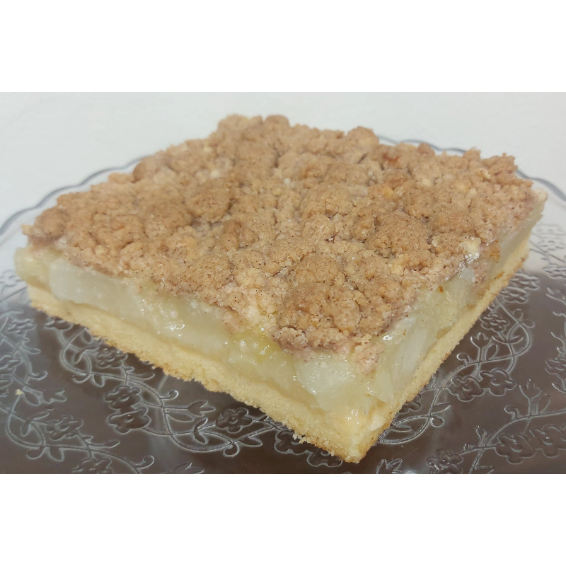 Jabłecznik na kruchym spodzie z kruszonką, wykończony cukrem pudrem